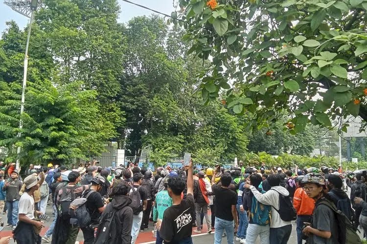 JAKARTA – Aksi unjuk rasa menolak gaji dan tunjangan DPR berujung bentrok, Senin (25/8). Ribuan massa memadati kawasan Gedung DPR/MPR RI, Senayan, Jakarta. Mereka menuntut DPR dibubarkan karena dinilai hidup mewah di atas penderitaan rakyat.