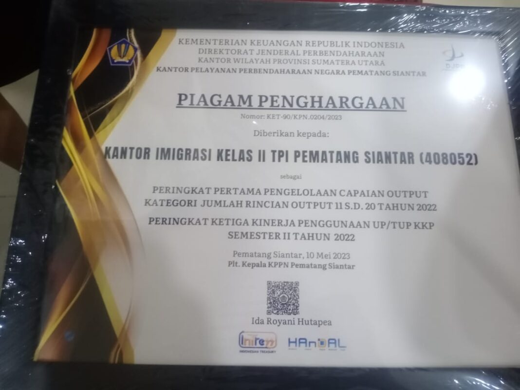 Kantor imigrasi Pematang Siantar mengucapkan terima kasih atas kepercayaan KPPN yang telah memberikan penghargaan kepada Kanim Siantar.(*)