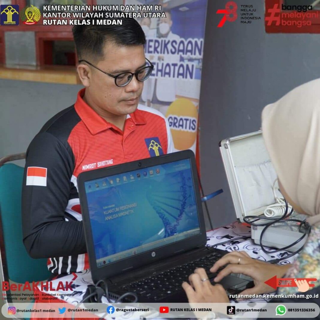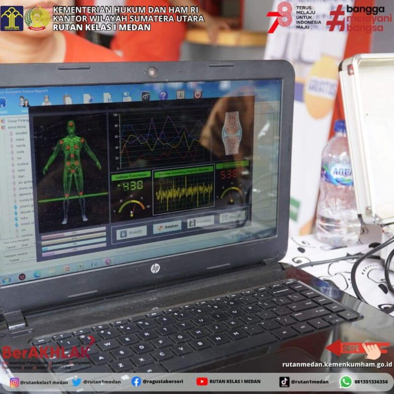 Bertempat di teras depan Rutan I Medan pemeriksaan kesehatan ini menggunakan alat Quantum Resonance Magnetic Analyzer ( QRMA ) adalah alat cek kondisi kesehatan yang berguna untuk mereferensikan kesehatan dari organ-organ di dalam tubuh.