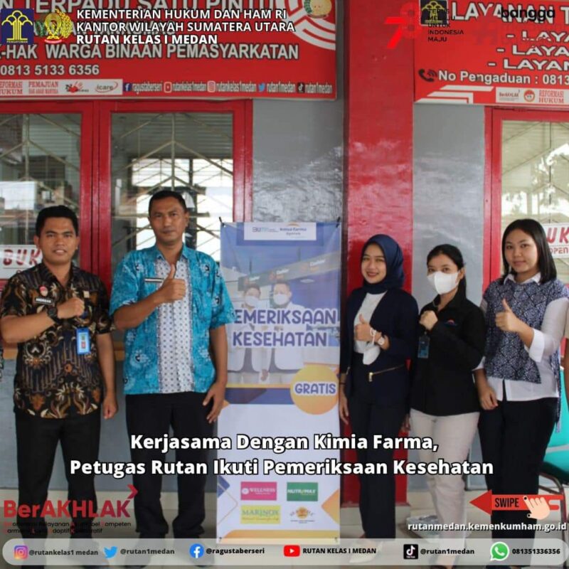 PristiwaNews // MEDAN – Dalam rangka meningkatkan kesehatan mencegah resiko terjadinya penyakit, melindungi diri dari ancaman penyakit serta berpartisipasi aktif dalam gerakan kesehatan, Rumah Tahanan Negara (Rutan) Kelas I Medan Kanwil Kemenkumham Sumut ikuti pemeriksaan kesehatan bekerjasama dengan Apotek Kimia Farma, Sabtu (16/9).