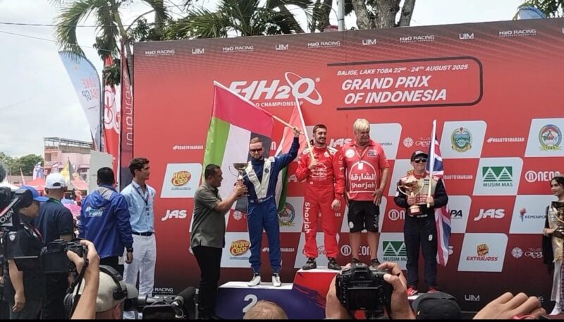 PristiwaNews, Kabupaten Toba- Meski sempat tertinggal satu putaran karena sempat mesin rusak, pebalap PowerBoat dari Kanada, Rusty Wyatt akhirnya mampu menyelesaikan putaran bersaing dengan Jonas Andersson dari Swedia di Final GP F1H20 di Perairan Danau Toba, Balige,Kabupaten Toba,Provinsi Sumatera Utara,Minggu(24/8/2025) di Veneu Balige.