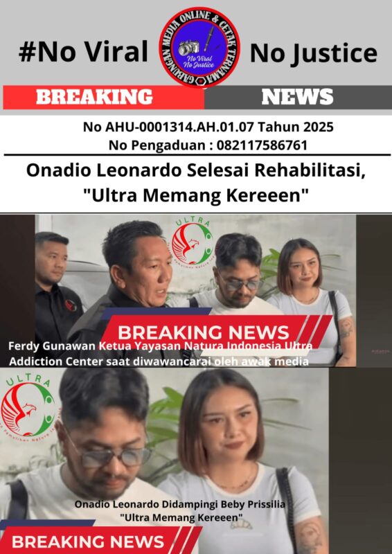 PristiwaNwes || Jakarta Selatan, 28 Januari 2026 – Artis Onadio Leonardo telah menyelesaikan masa rehabilitasi yang dimulai sejak tanggal 04 November 2025 di Yayasan Rehabilitasi Natura Indonesia Ultra Addiction Center, berlokasi di Jalan Pertanian Raya No.59 B, RT.004/RW.004, Lebak Bulus, Kecamatan Cilandak, Kota Jakarta Selatan.