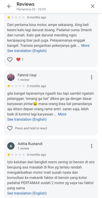 Penelusuran terhadap ulasan di Google Review memperlihatkan banyaknya keluhan publik terkait SPBU yang sama. Mulai dari sikap petugas yang tidak sopan, lambannya pelayanan, hingga kesan tidak adanya tanggung jawab dalam melayani konsumen.