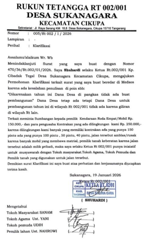 PristiwaNews || Tangerang – Assalamu’alaikum Perkenalkan saya Shuhardi/ Bedog sebagai ketua RT 02.RW 01 menyampaikan permohonan klarifikasi terkait proposal yang saya buat waktu itu dan saya memohon maaf dan sebelumnya sekali lagi saya mohon maaf kepada semua warga, dan khusus nya warga RT 02 RW 01 Kp Cibadak Tegal Desa Sukanagara, terkait penulisan yang saya buat dana desa dan dana desa tersebut ada tapi untuk dana desa di alihkan ke wilayah RT yang lain dan untuk diwilayah saya tahun ini belum ada dikarnakan sudah dilaksanakan di tahun 2025 ada dua titik pembangunan, maka dari itu saya memohon maaf yang sebesar besarnya kepada semua warga dengan kegaduhan ini dan saya pribadi tidak akan mengulangi lagi dengan kejadian yang saya buat ini. Tidak mengurangi rasa hormat saya sekali lagi mohon maaf yang sedalam-dalamnya, assalamu’alaikum warohmatulohi wabarakatuh. ucap Ketua RT 02 RW 01 Shuhardi/ Bedog.