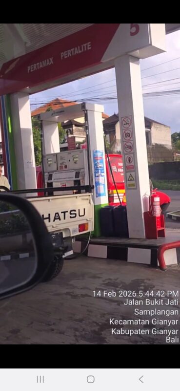 PristiwaN| GIANYAR, Praktik pembelian BBM bersubsidi menggunakan jerigen kembali mencuat. Kali ini terjadi di wilayah Gianyar. Pada 14 Februari 2026, awak media menemukan fakta di lapangan: sejumlah pengendara sepeda motor datang ke SPBU 54.805.24 dengan membawa jerigen kosong, lalu dengan leluasa mengisi Pertalite dalam jumlah besar.