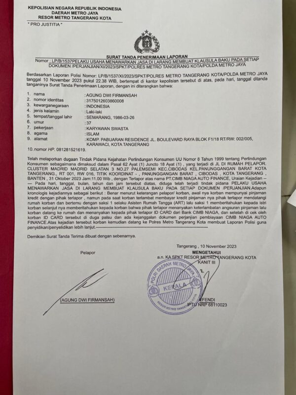 Pasalnya, sejak dirinya melakukan pelaporan dengan LP Polisi Nomor : LP/B/1537/XI/2023/SPKT/POLRES METRO TANGERANG KOTA/POLDA METRO JAYA , tertanggal 10 November 2023, hingga saat ini belum ada tindakan serius dan nyata dari penyidik terhadap terlapor (CIMB Niaga Auto Finance red) yang diduga telah melanggar Undang-Undang No 8 Tahun 1999 tentang Perlindungan Konsumen dan juga terindikasi terlapor melakukan pengelapan (adanya selisih pencairan uang dari Terlapor kepada Pelapor).