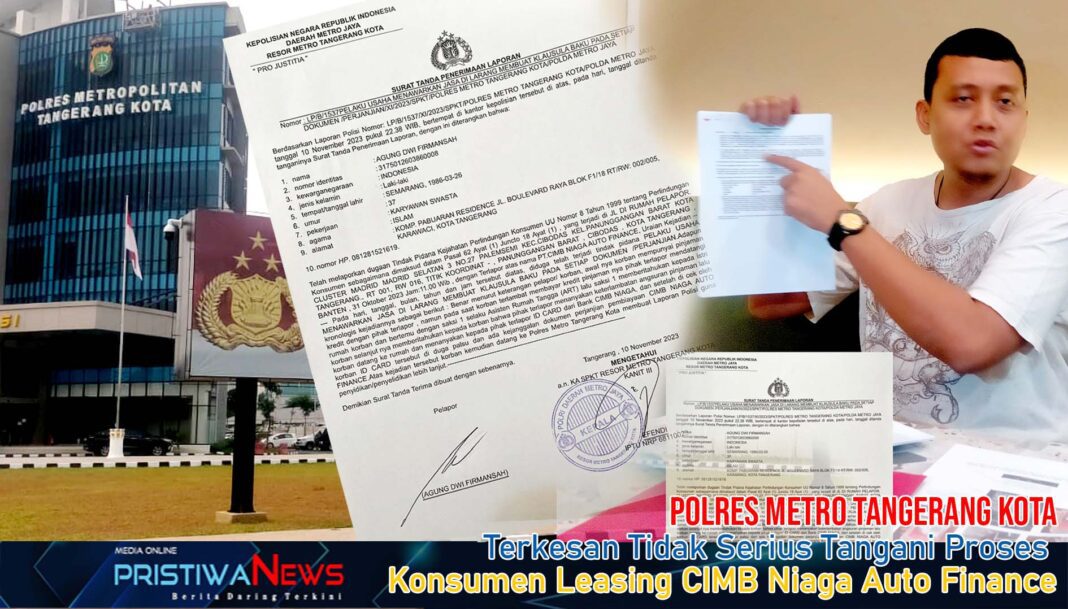 PristiwaNews | Kota Tangerang – Direktur PT AS Berjaya, Agung Dwi Firmansah yang juga sebagai konsumen CIMB Niaga Auto Finance (CNAF) merasa kecewa kepada penyidik unit Krimsus Sat Res Kriminal Umum Polres Metro Tangerang Kota.