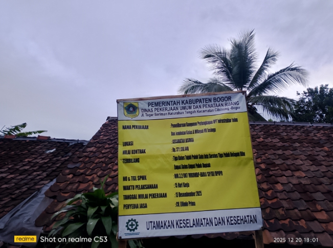 Berdasarkan papan informasi, pelaksanaan kegiatan dari CV. Ellindo Prima dengan nilai anggaran Rp. 371.138.440 melalui Dinas Pekerjaan Umum dan Penataan Ruang (DPUPR) Kabupaten Bogor, dengan waktu pengerjaan 15 hari kerja.