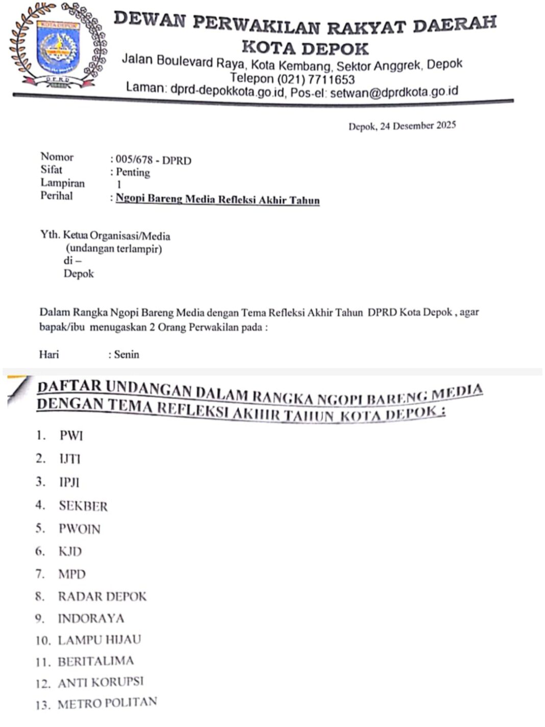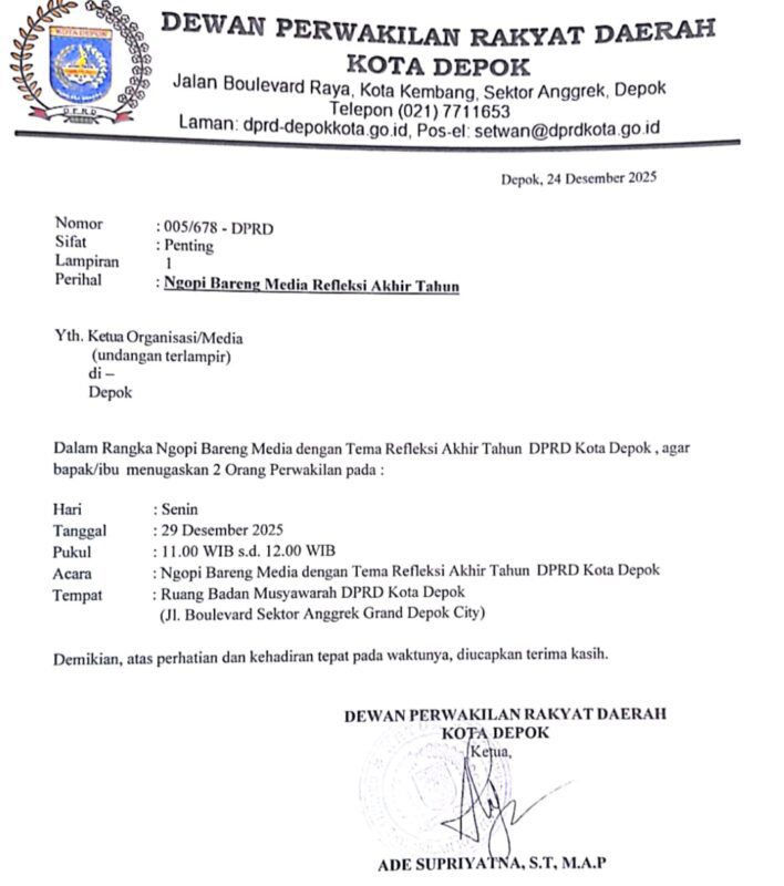 PristiwaNews | Depok – Agenda Ngopi Bareng Media Refleksi Akhir Tahun 2025 yang digelar DPRD Kota Depok Jawa Barat menuai sorotan dan pertanyaan. Pasalnya, berdasarkan surat undangan yang ditandatangani oleh Ketua DPRD Kota Depok Ade Supriyatna itu hanya mengundang segelintir media dan organisasi tertentu.