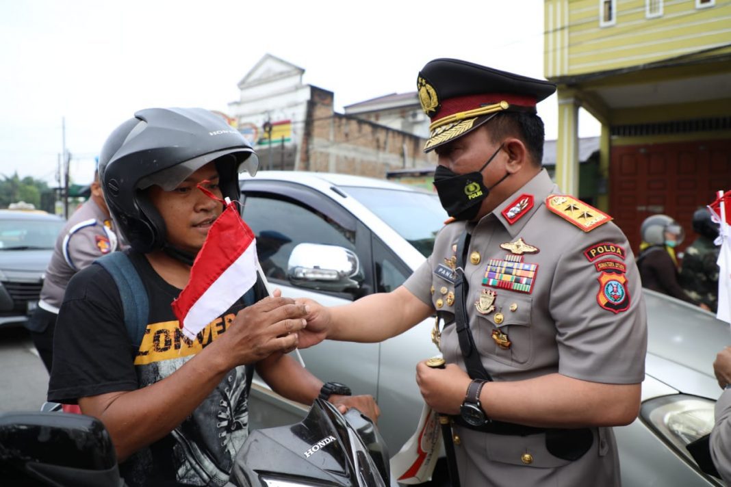Kapolda Sumut Irjen Pol. Drs. R.Z. Panca Putra S., M.Si bersama Gubernur Sumut Eddy Rahmayadi dan Pangdam I/BB Mayjen TNI A Chardin pun tak ketinggalan turun langsung membagikan bendera dan menempelkan sticker ke kendaraan milik masyarakat.