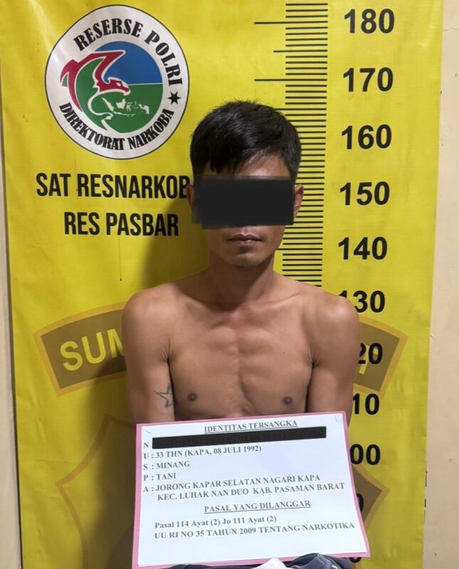 PristiwaNews, Pasaman Barat – Seorang pria yang kesehariannya berprofesi sebagai petani diringkus tim Opsnal Satuan Reserse Narkoba Polres Pasaman Barat, Sumatera Barat (Sumbar), diduga melakukan tindak pidana peredaran gelap Narkotika golongan I jenis ganja.