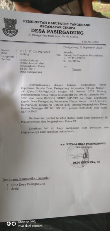 PristiwaNews, Kabupaten Tangerang – Rangkaian perjalanan yang berupa kemelut di pasirgadung hingga kini belum ada titik temu, walaupun surat keberatan dari warga sudah dilayangkan ke pemdes terkait pemberitahuan pemberhentian ketua RT yang sepihak.
